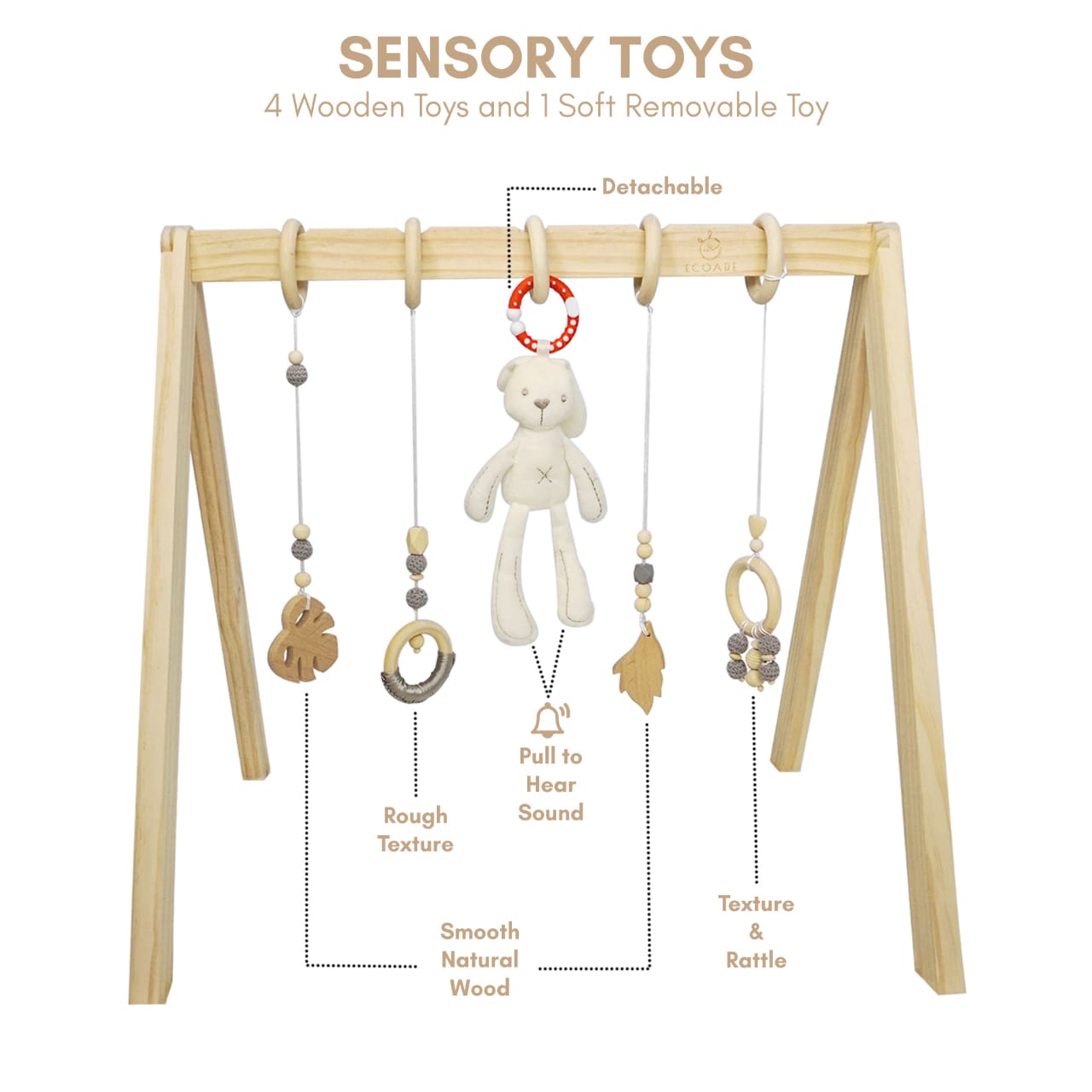 Wooden Play Gym - Activity Gym for Baby with 4 Hanging Wooden Baby Toys and 1 Bunny Rattle, Gender Neutral Boho Nursery Decor